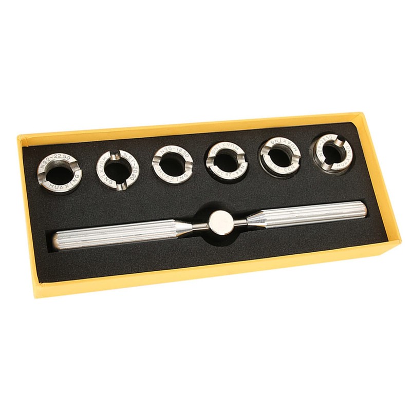 Great for opening and closing screw back case, especially for Rolex oyster model. Including a wrench and six grooved dies of different diameters. Adopting premium steel material with stable construction, it is rustless and Easy and handy to take with you because its small size and light weight. It comes with a storage box for easy storage and well organization.