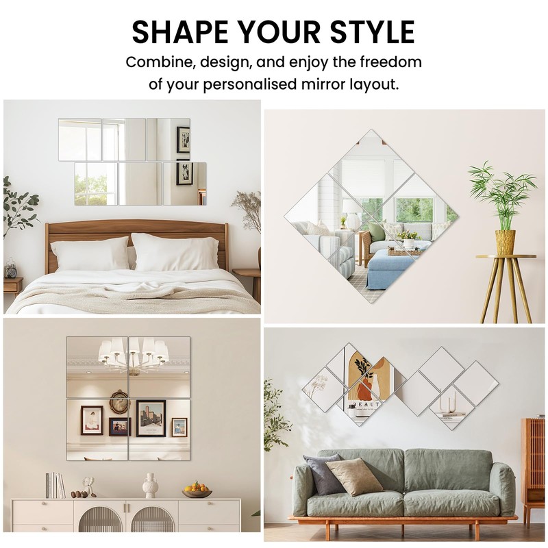 - MIRROR TILES FOR DIY : Set of 12Pcs full length Wall Mirror - mirror tiles, each mirror tile is 12" x12". This self-adhesive glass mirror tiles can be combined according to your wishes to form square, rectangular, or various irregular shapes, make your home more elegant and warm.