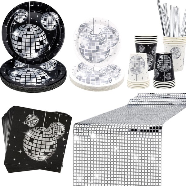 - Safety and Good Materials: 100% food grade materials. Plates, cups, and napkins, are made of white paperboard. The silver disco table runner is made of polyester material, strong and solid.