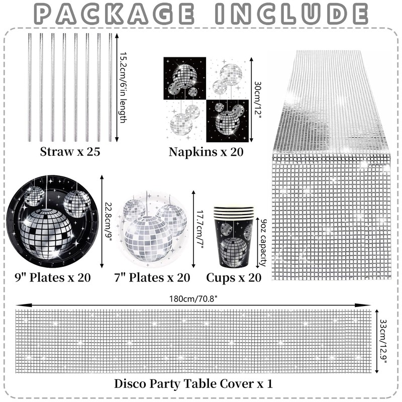 - Package Quantity: Include 20 x9inch dinner plates, 20 x 7inch desserts plates, 20 x cups, 20 x napkins, 20 x straws,1 x disco table runner 105 x 54 inches, 2 x ribbons, 2 x glue points.