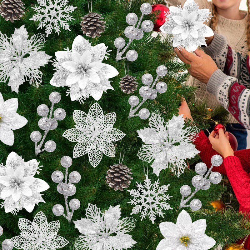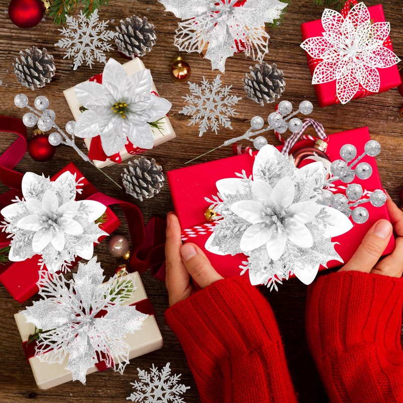 - Premium Materials: Christmas Artificial poinsettia flowers are made of durable plastic, high quality fabric and glitter, which is reusable and not easy to fade.Artificial red berries stems are made of high quality foam and metal wire. This set can be flexibly matched in Christmas tree decor, making it more charming.