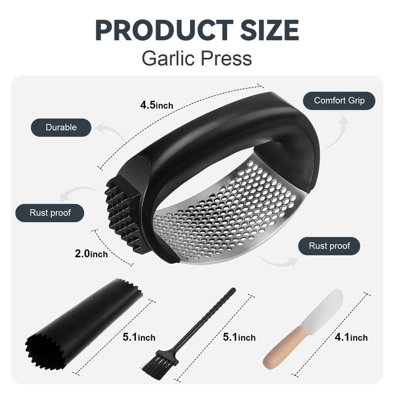 • 【EASY TO CLEAN AND STORE】Cleaning is a breeze! Rinse the garlic chopper or toss it in the dishwasher. The included brush cleans out any garlic residue, ensuring a thorough clean. The garlic crusher stainless steel design is durable and easy to maintain, keeping it in top condition with minimal effort