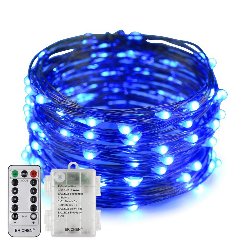 • Super 100 super bright LEDs: 100 blue LED bulbs on 33 ft high quality copper wire. They illuminate your patio or garden and add a cheerful atmosphere to your party and holiday.