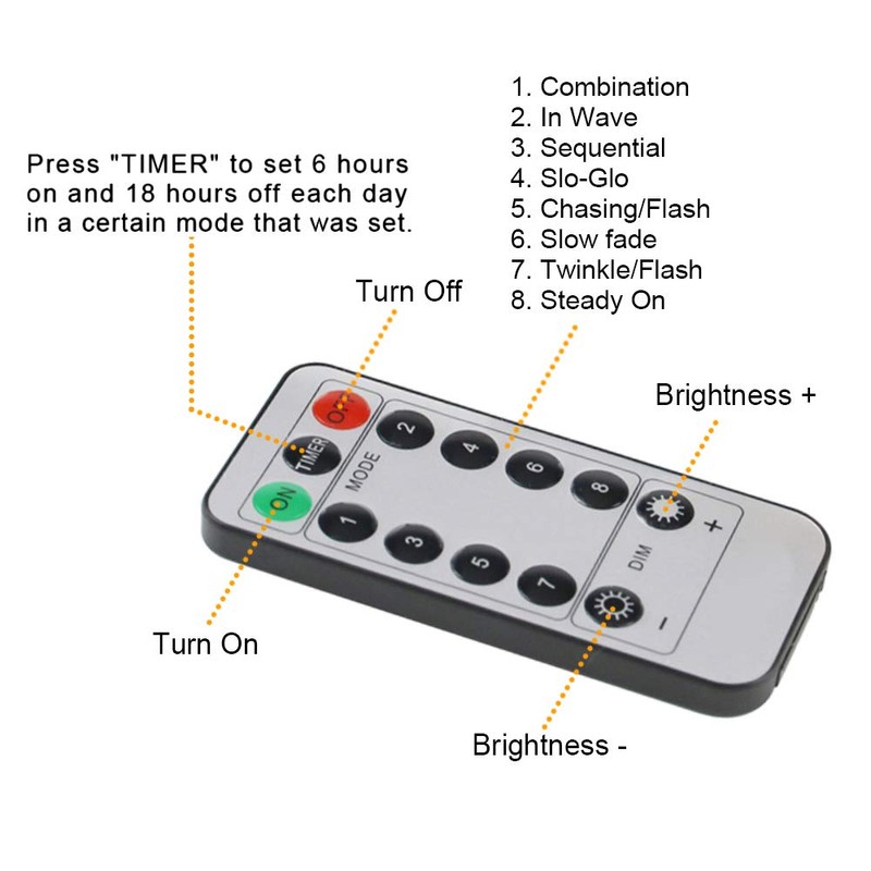 • 【8 Selectable Function Modes】: 8 modes include steady light, slow fade, twinkle, wave, flash, track, etc. With the 13-button remote control, you can turn the light on and off, change the mode, adjust the brightness and set the timer.