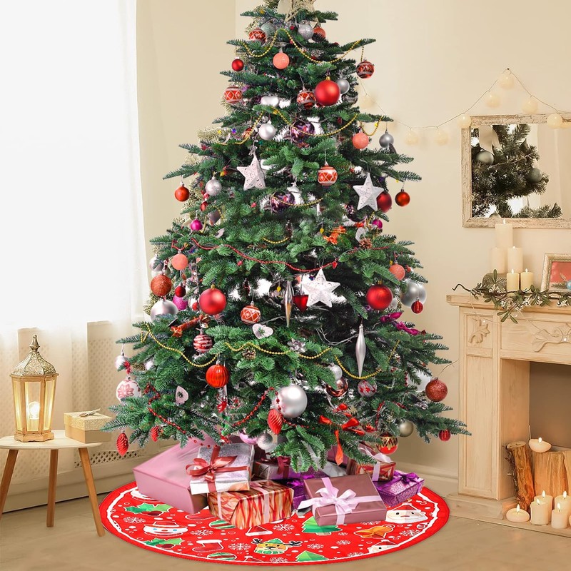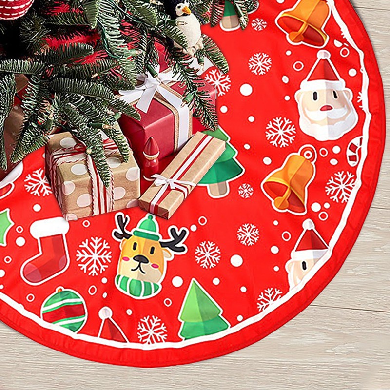 - Cute Patterns The design of this Christmas tree skirt is mainly red, with prints of Santa Claus, Christmas trees, reindeer and snowflakes, which is cute and beautiful.