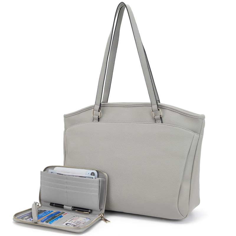 - 3.Travel-Ready & Ultra-Lightweight Design:Tote dimensions: 17.5"L x 5"W x 11.8"H (1.88lbs). Wallet dimensions: 8.5"L x 1.2"W x 4.7"H (0.5lbs). Luggage sleeve fits 2" suitcase handles. Dual shoulder straps for airport/commute ease.