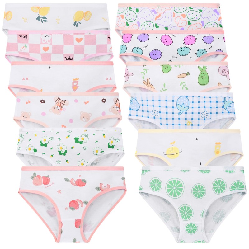 - VARIETY PACK: Set includes 12 pairs of girls' underwear featuring adorable prints with fruits, flowers, animals, and playful patternseach,Each pack has 12 unique designs, but 2-3 patterns may repeat.