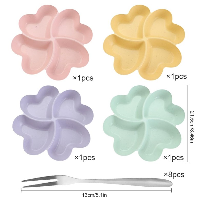 YZROHYI 4 Stück Herzförmige Snackteller mit Fächern Kinder,Snackplatter Wiederverwendbar,süßigkeiten Teller,Snackschale,Plastik Snackteller,Obstteller Kunststoff mit 8 Fruchtgabel Aus Edelstahl