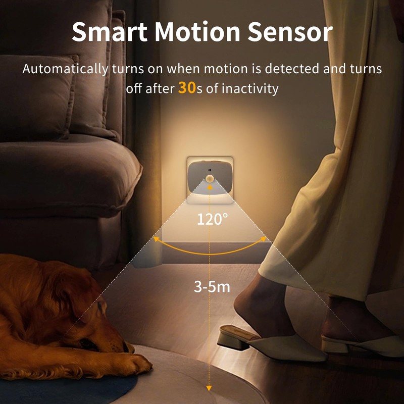 - Auto mode: the motion sensor detects human movements within a radius of 3-5 meters and 120°. The LED night light with motion sensor automatically lights up when motion is detected in dark environments. If no motion is detected, it turns off automatically after 30 seconds. This saves energy.