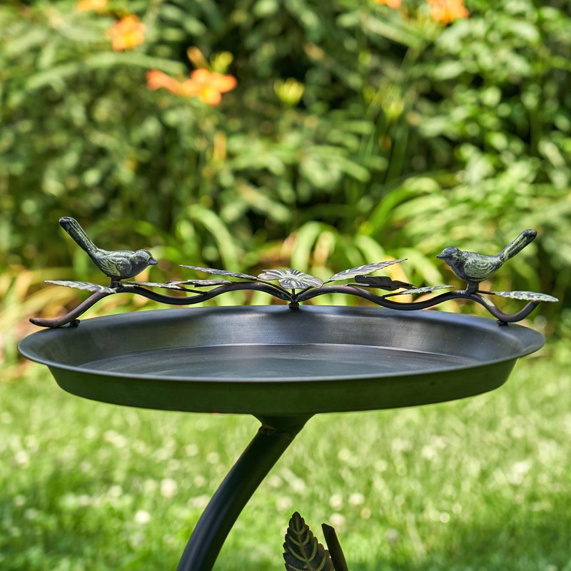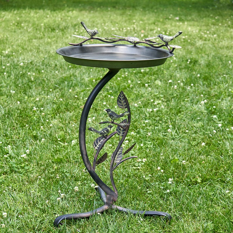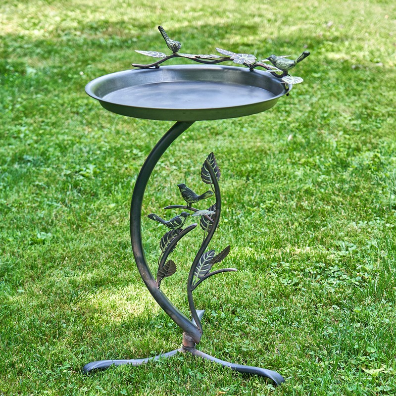 - This birdbath is an excellent addition to your yard or garden. It is a beautiful and sturdy design, and looks great wherever its used. This shallow birdbath is made entirely out of metal and is powder coated and sealed for outdoor use. As an alternative use, you can also use this as a plant stand too!