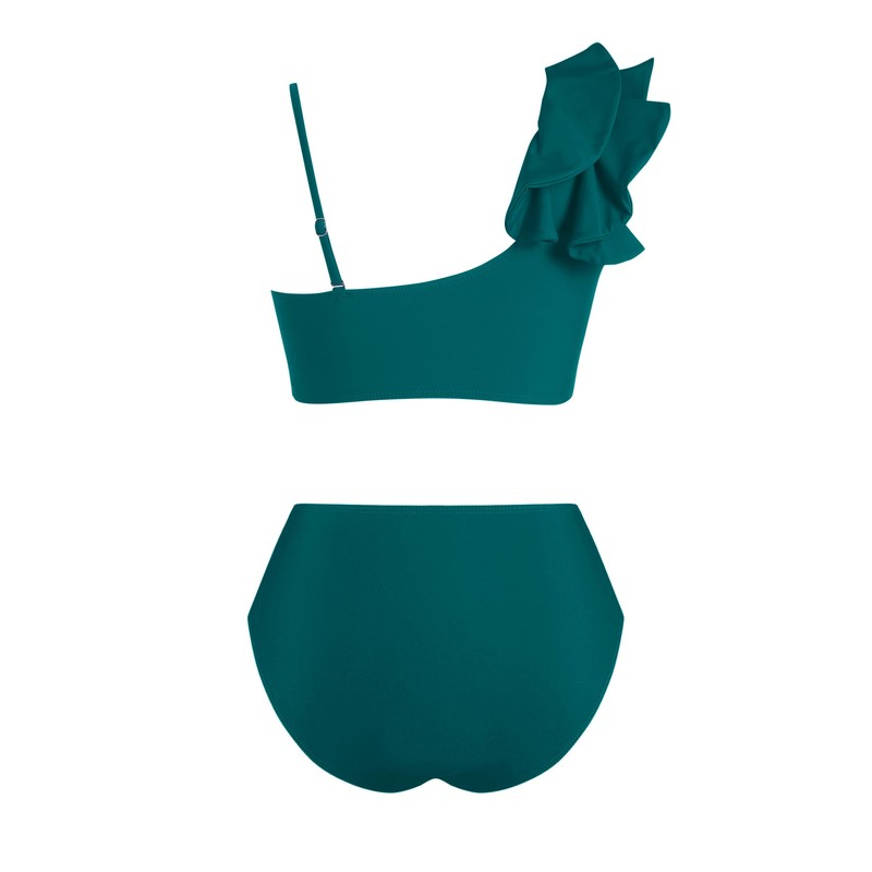 - Adjustable straps swimsuit: This fashionable bikini set has a front knot design. One shoulder strap has ruffles and the other has thin straps. The shoulder straps are adjustable, which is a cute and trendy match. High-waisted swim trunks make you feel safe while exuding summer charm