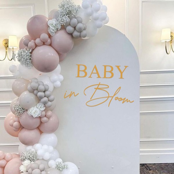 - LUXURIOUS ELEGANCE - Elevate the ambiance of your baby shower party with this stunning "Baby in Bloom" wall decal, featuring shimmering gold yellow lettering that adds a touch of luxury and sophistication to your balloon arch backdrop.