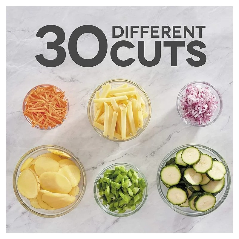 - VERSATILE: With 30 plus slicing options, the mandoline cuts perfectly-even slices from 1-8mm in thickness while also offering julienne, matchstick and dicing options.