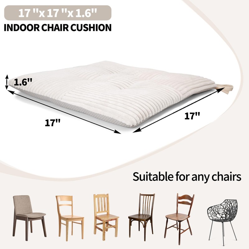 - 【PRODUCT DETAILS】17 "x 17 "x 1.6, Fits most square chairs, Fill with high density foam and match with silicone dot non-slip bottom. Suitable for dining, kitchen chairs, folding, rocking chairs, and bar stools. Please measure your furniture before ordering, and after receiving and unpacking the package, please allow about 48 hours for the cushion foam to rebound to its original shape.
