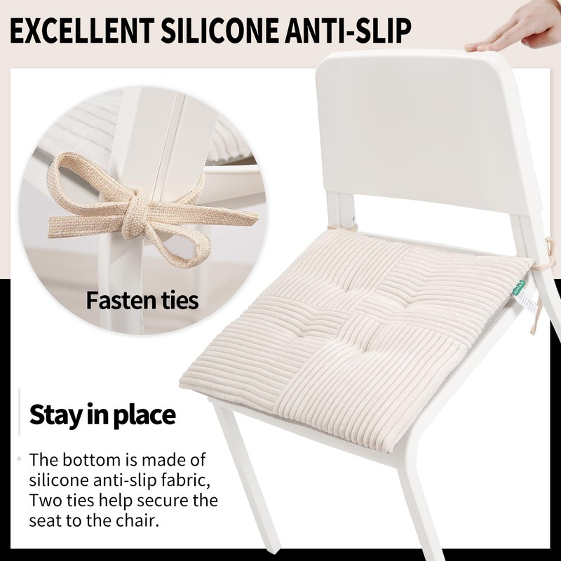 Zalvox Thin Chair Cushion for Dining Chair 4 Pack, Corduroy High Density Foam Kitchen Seat Cushion with Ties, Square 17" x 17" Indoor Fashion Non-Slip Chair Pads,White,4pcs
