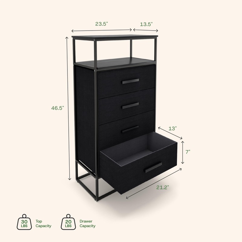 - ππππππππ ππ πππππ ππ πππ - With 4 spacious drawers, this premium dresser offers ample room to store jeans, sweaters, documents, makeup, etc. Each drawer is built to hold up to 20 lbs with ease. This dresser also has a stylish wooden top shelf having a huge 30 lbs weight capacity to keep essentials on top. The drawers are sag-proof fabric bins glide smoothly & maintain their structure over time.
