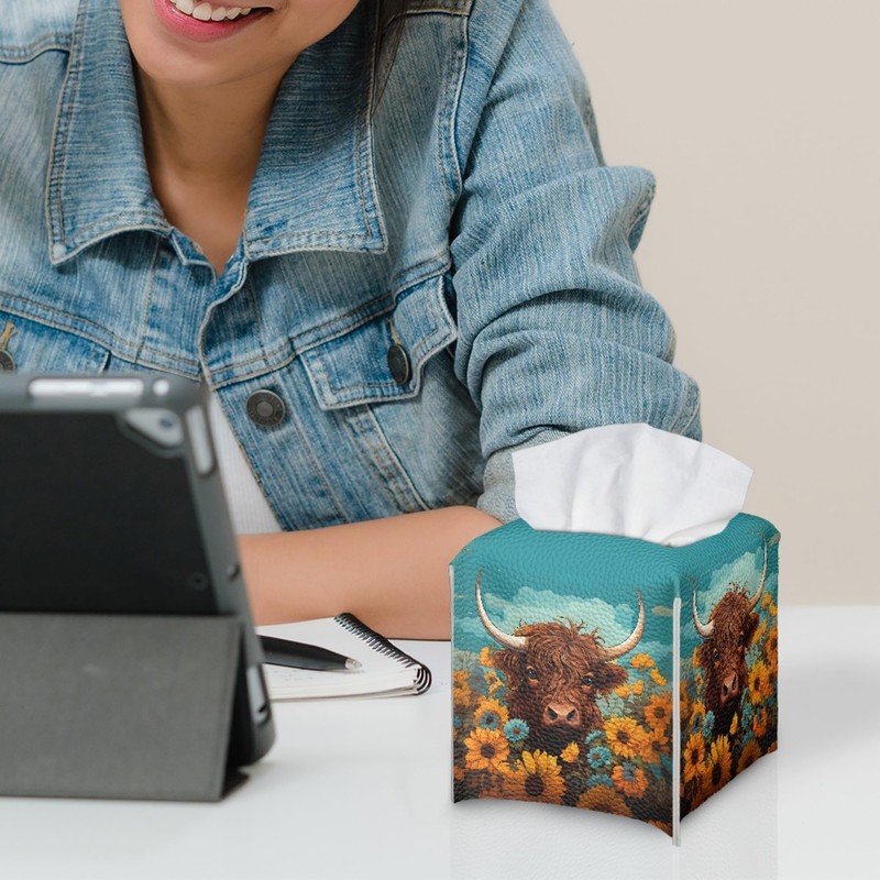 Zanxiantu Highland Cow Leather Tissue Box Cover Sunflower Square Tissue Box Holder Home Decorative Paper Organizer Dispenser Bathroom Car Office Tissue Cube Box Cover