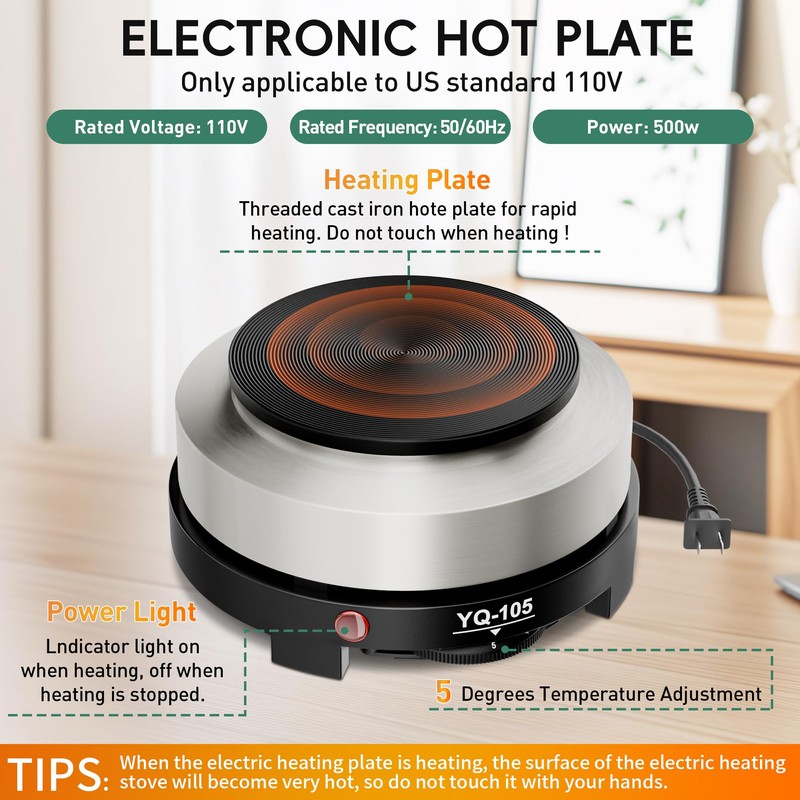 110v-500w Electric Hot Plate (only supports the voltage of American Standard 110V). 1-5 gears, the third gear is recommended to prevent the temperature from being too high.