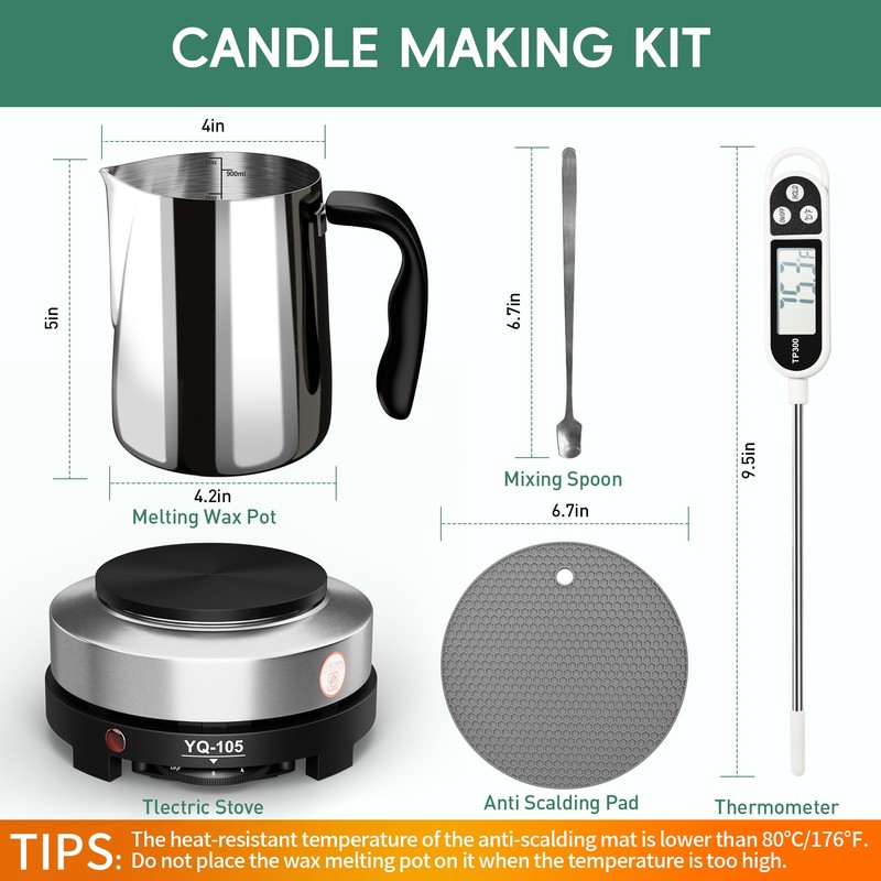 - Candle Making Kit with Hot Plate: We provide a variety of accessories to assist beginners in making perfect candles, including 900ml Stainless Steel Wax Melting Pot, 500w Hot Plate, Anti-Scald Pads, Stirring Spoon, Thermometer. The electric heating plate only supports the American standard 110V voltage