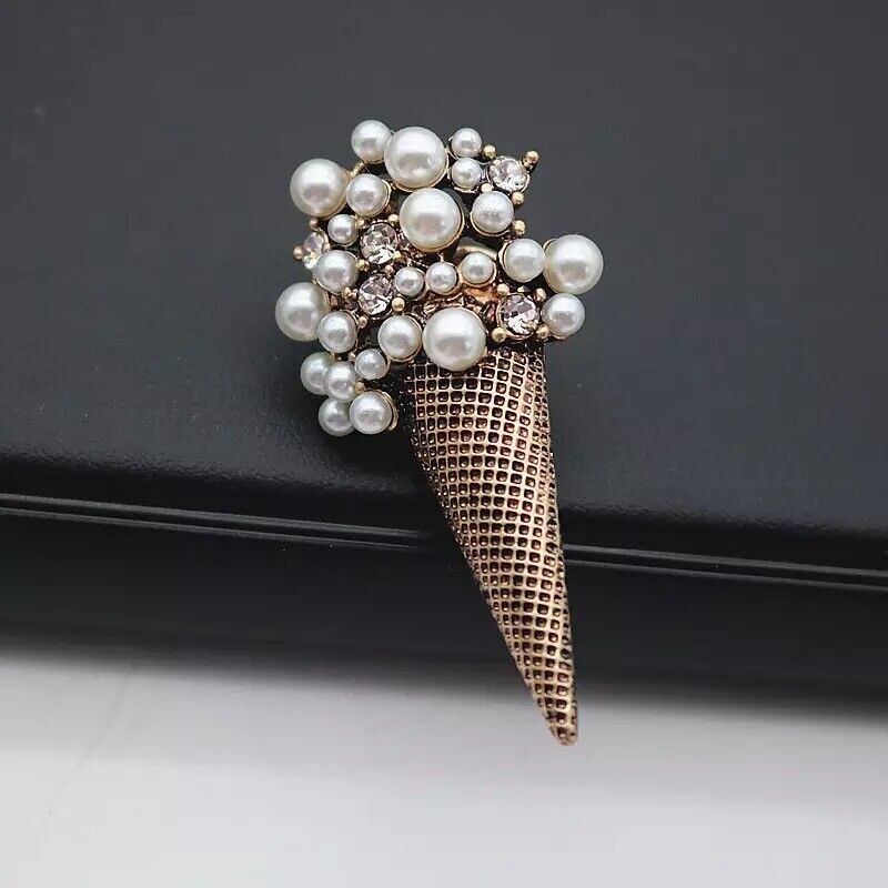 ZARD Ice-Cream Cone Pin Brooch in White Rhinestone and Beads Accent