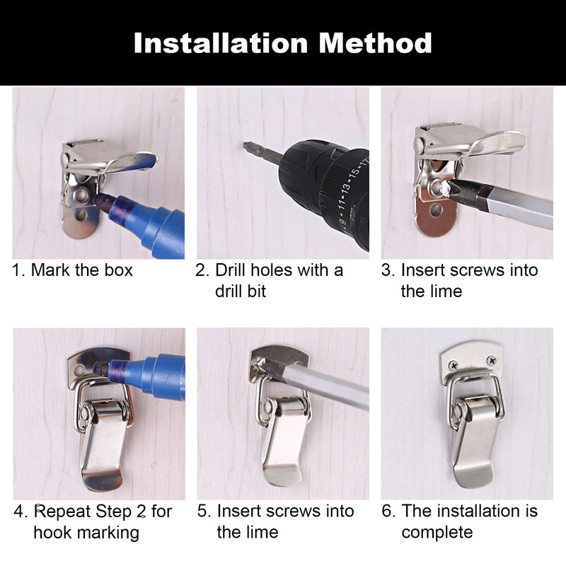- Easy to install: the box closure clip is easy to install, just attach the fastener to the tool box or cabinet you want to install, then align the screws to the small holes and screw them in to secure them. Easy to install and use.