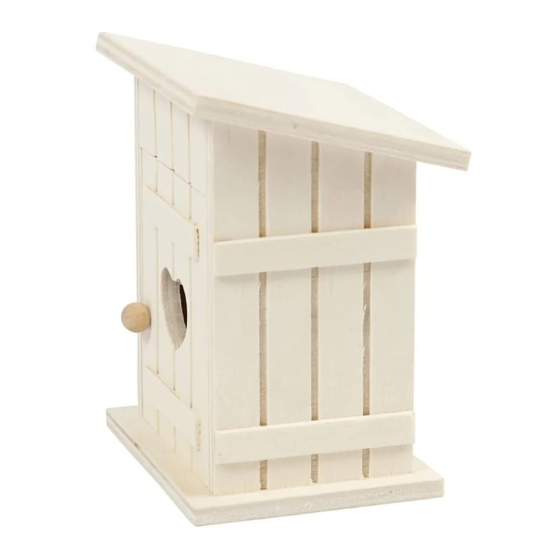 - A miniature wooden toilet house with a cut-out heart in the door that can also be opened