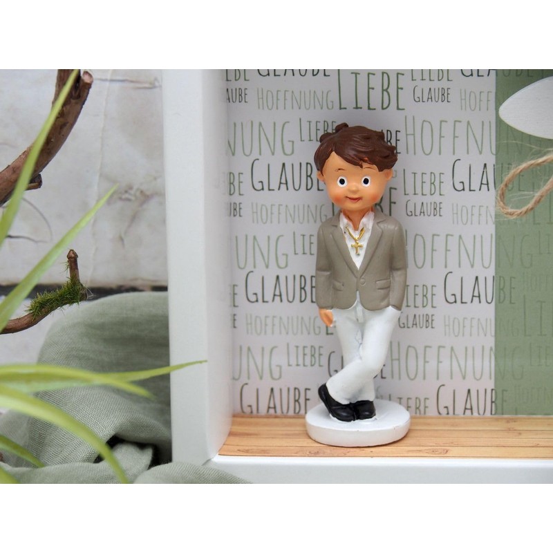 - Contents: a small decorative figure 'Communion/Confirmation Boy', a wooden clip with small wooden fish, as well as a background printed on paper