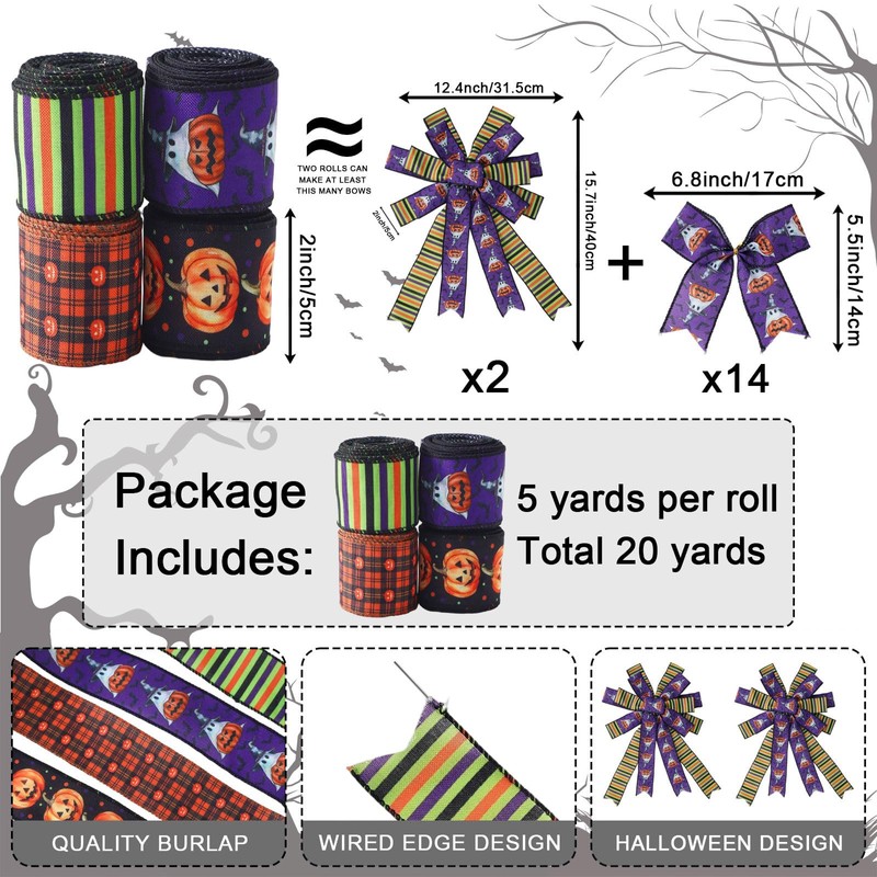 ZAWE 4 Rolls Halloween Ribbon 2" 20 Yards Stripes Evil Pumpkins Cute Ghosts Bats Wired Edge Ribbon for Home Bow Wreath DIY Craft Gift Wrap Fall Party Decorations