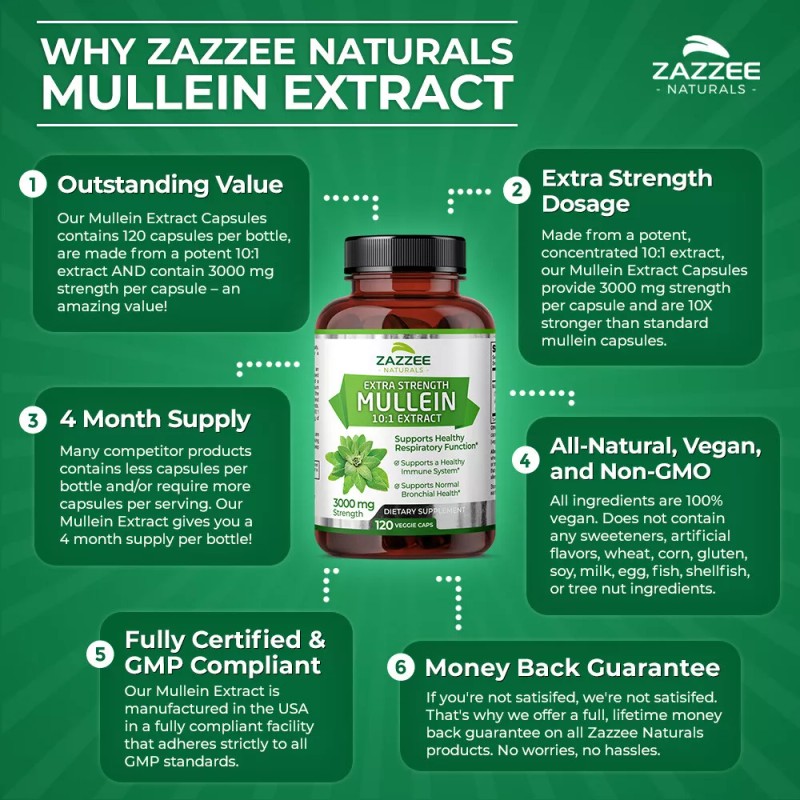 Zazzee Extra Strength Mullein 10:1 Extract, 3000 mg Strength, 120 Vegan Capsules