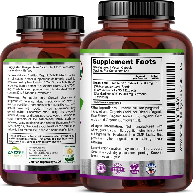 - USDA CERTIFIED ORGANIC: Any Milk Thistle that is not CERTIFIED organic can be highly contaminated and even toxic to your liver. With Zazzee Naturals Certified Organic Milk Thistle, you can be sure your Milk Thistle is organic, all-natural, vegan, and non-GMO. More, while other competing products use various chemicals as fillers, binders, and excipients, our Organic Milk Thistle instead uses a unique Organic Stabilizer Blend.