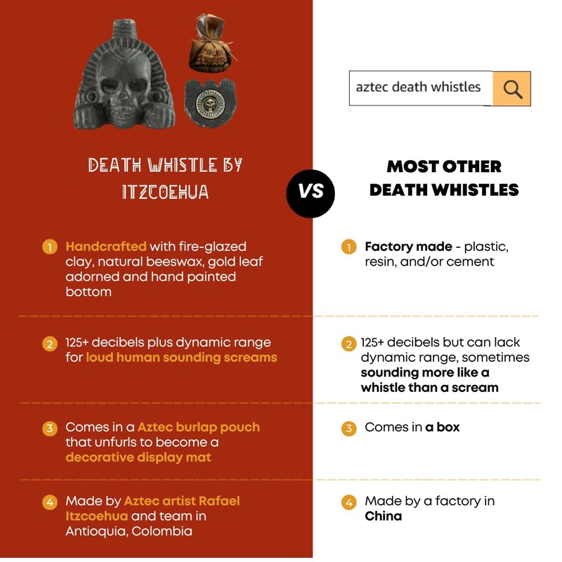 - HISTORICAL: Aztec Death Whistles have been used throughout history as super loud and terrifying instruments of religion and war. Embrace ancient Aztec civilization with this piece.