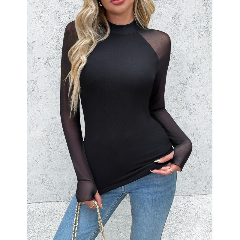 Zeagoo Fall Tops for Women 2025 Black Mesh Mock Neck Long Sleeve Shirts Double Lined Undershirts
