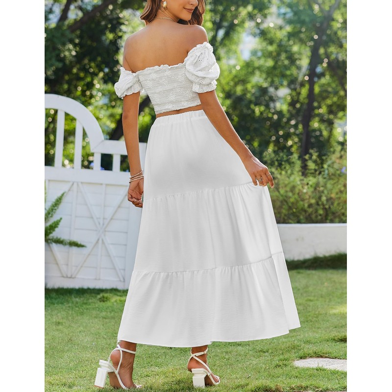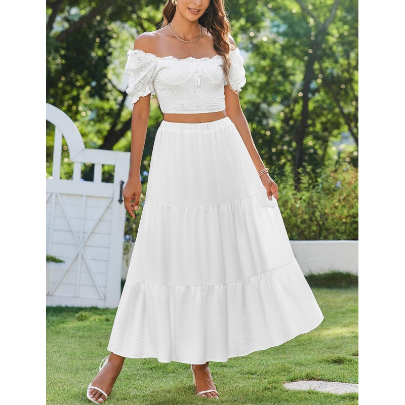 - Design: high waisted elastic band, A-line skirt, pockets, double layer ruffle maxi skirt, solid color, bohemian print. The elastic waistband of the flowing skirt ensures a comfortable fit and the tiered ruffle skirt adds a touch of elegance.