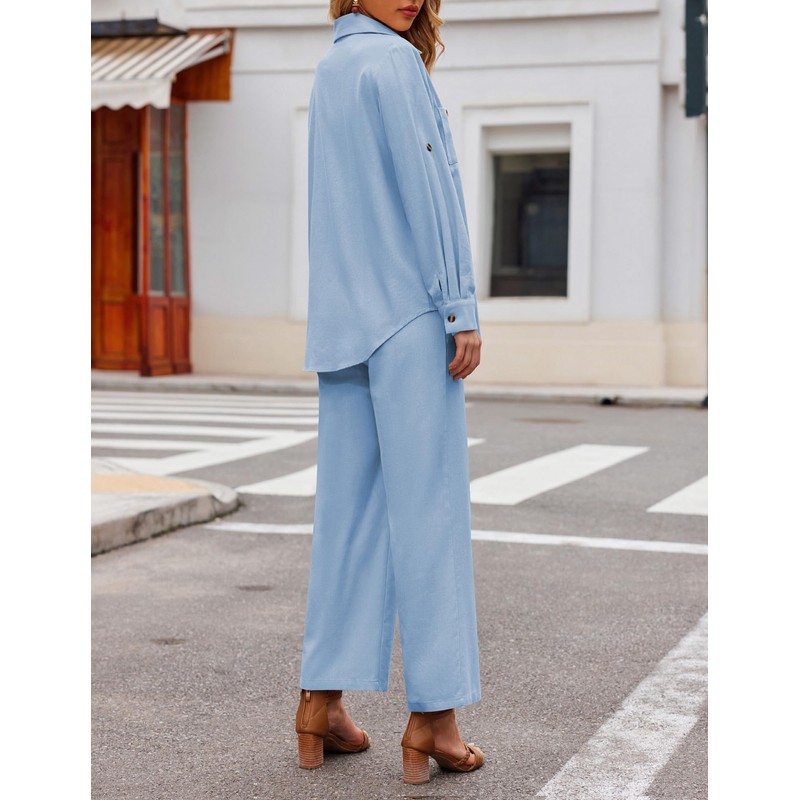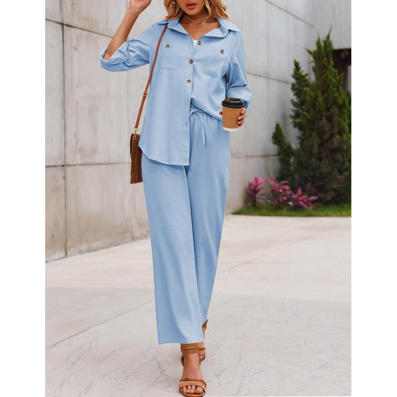Zeagoo Women 2 Piece Linen Sets 2025 Button Down Shirt and Drawstring Long Pants Set Summer Outfits,Light Blue,X-Large