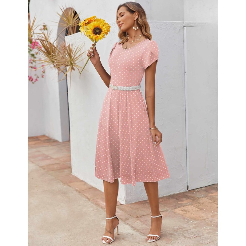 Zeagoo Womens A Line Cotton Dress Short Sleeve Summer Dresses Midi Length Floral Sundress Flowy Boho Beach Dress, Pink Dot,L