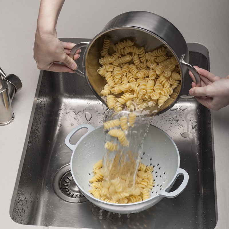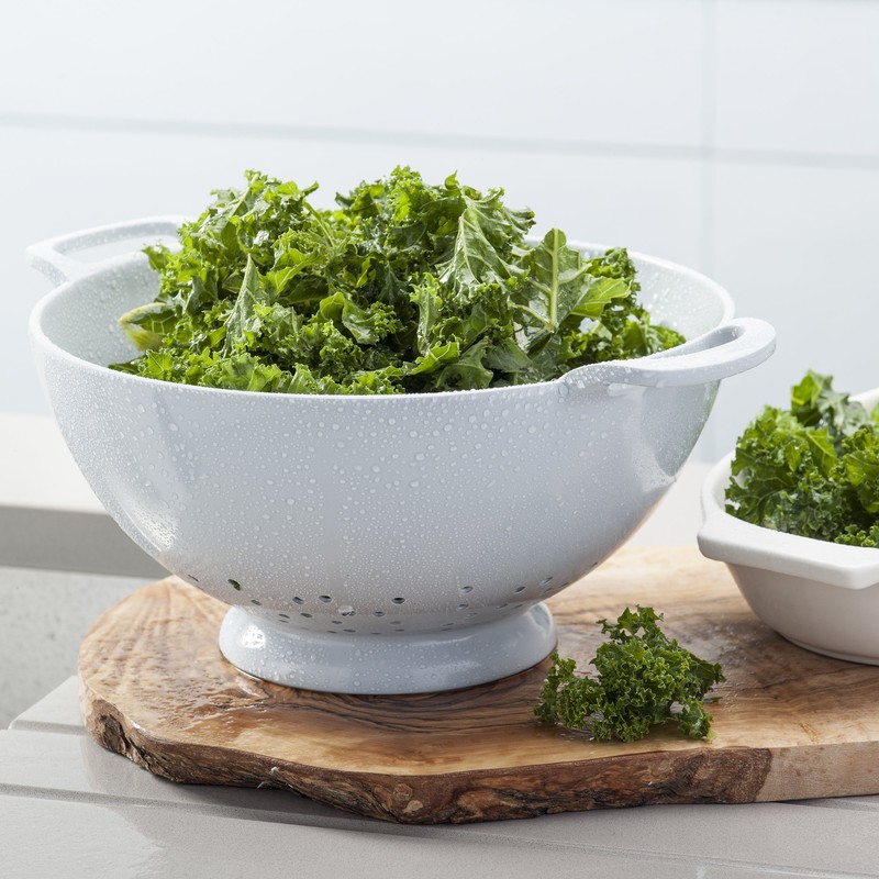 - Stands without support due to the circular foot on the base and there are holes in the base of the colander ensuring no liquid remains