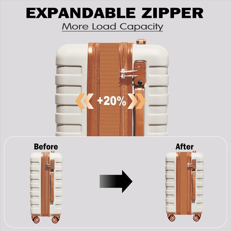 Zebra 20" Expandable Carry-On Luggage Set with TSA Lock, Lightweight Hardshell Suitcase with Spinner Wheels, PC+ABS Durable Checked Luggage, Bonus Travel Backpack & Cosmetic Makeup Bag, White-Brown