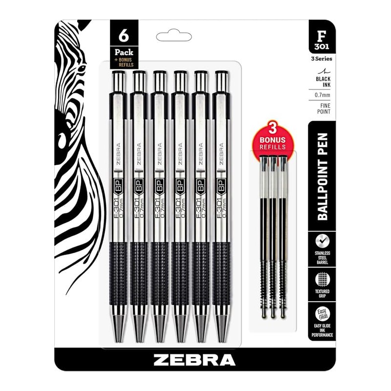 - COMBO PACK of 6 Zebra ink pens F301 Black Ink , with 3 Black color ink Refills, The Ball Point Zebra pen is 0.7mm fine point tip, The refill is designed to complement Zebra's F-301, F-402, F-701, F301 Compact and 301A 0.7mm ballpoint pens