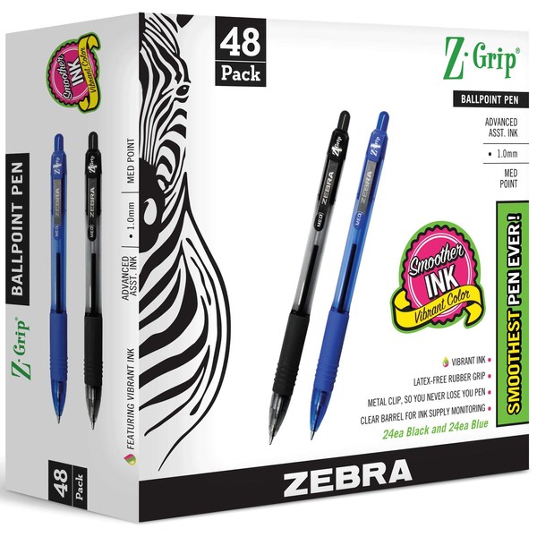 - Zebra pack of 48 pens - 24 Black and 24 Blue ink pen included in set, Zgrip, 1mm medium point ball point pen featuring low viscosity for a smooth, skip-less writing experience and quicker writing speeds
