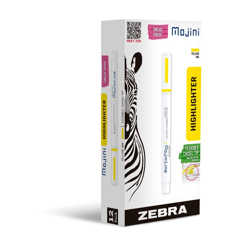 Zebra Pen Mojini Yellow Highlighter Marker, Flexible Chisel Tip, Yellow Ink, 12-Pack (70250)