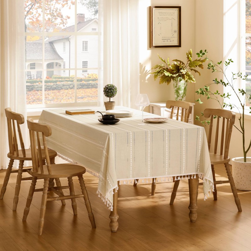 ZeeMart Hemstitched Embroidery Striped Boho Tablecloth 54x54 Inch Beige, Heav...