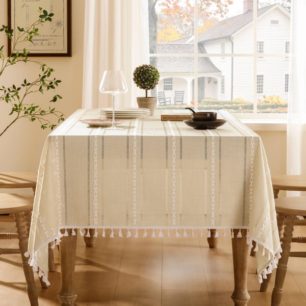 ZeeMart Hemstitched Embroidery Striped Boho Tablecloth 54x54 Inch Beige, Heavy Weight Farmhouse Burlap Linen Beige Tablecloth, Wrinkle Resistant Washable Table Cloth for Square Table