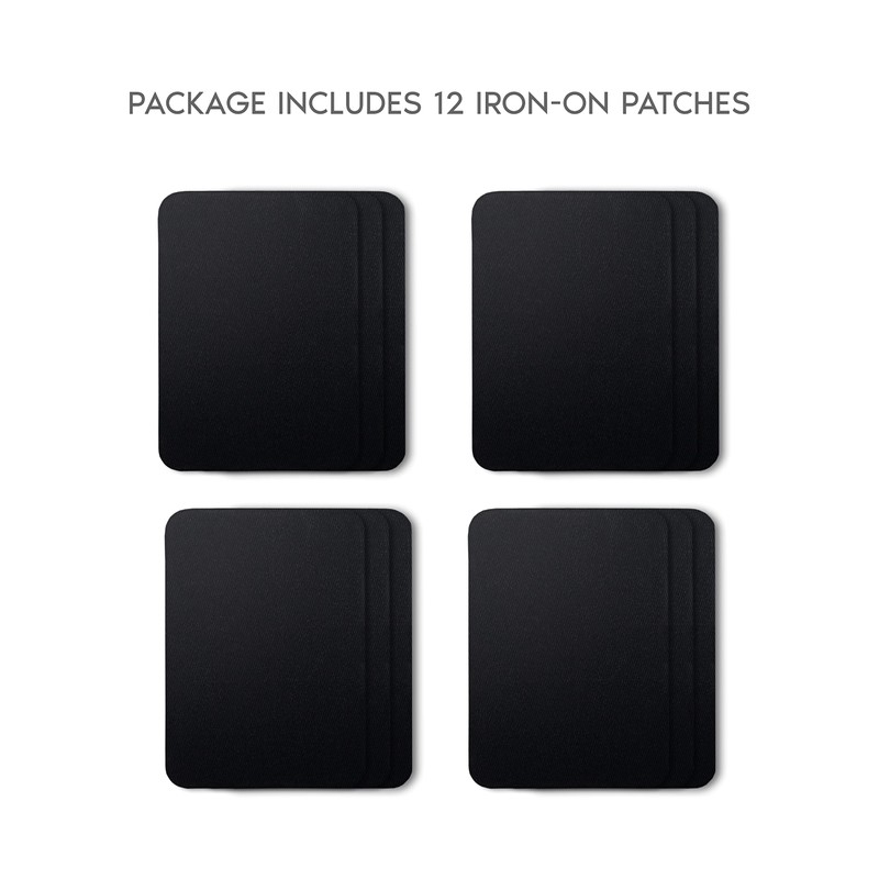 - ??????? ????????: 12 iron-on fabric patches, size 3" by 4-1/4" (7.5 cm x 10.5 cm). Ideal size will help to conceal the shortcomings of both small and large holes and enough to create your own design. Black color will perfectly match your different clothes. Front side of the patches is 100% cotton, rear side is covered with the strongest hot-melt adhesive film. Patches made in EU using high quality materials.