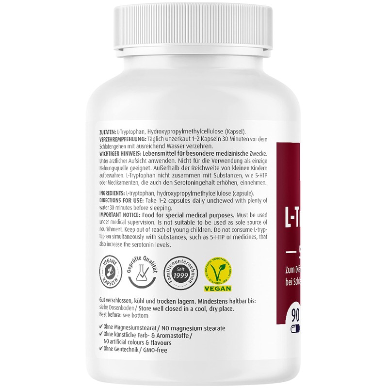 - 100% vegan: the L-tryptophan capsules 500 mg are certified with the vegan quality seal and are free from artificial flavours and dyes