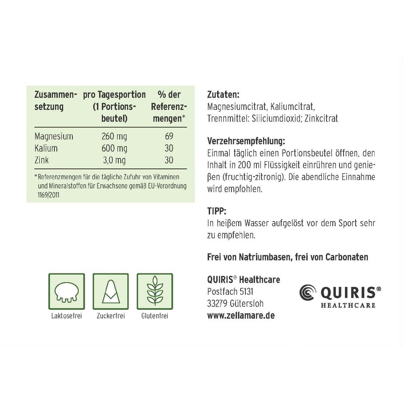 - Only once a day: open the single bag, and stir the contents together in 200 ml of liquid and enjoy. Particularly recommended is the evening intake. Die in ZELLAMARE BASE enthaltenen Citrate entfalten ihre Wirkung auf besonders schonende Weise. It contains no gas-forming carbonates.