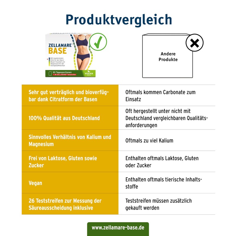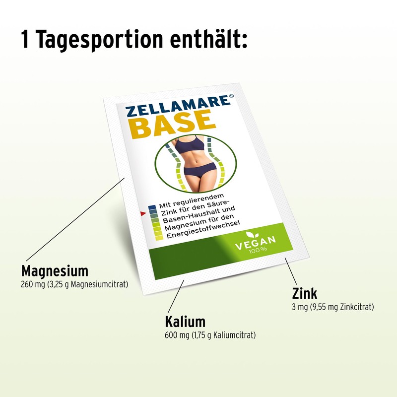 - Better energy change: due to acidification, the metabolism is slower and calorie requirements decrease, fat burning is reduced and body weight increases. Exhaustion and fatigue are the result. ZELLAMARE BASE has been developed to optimally support the body in balancing the body's acid-base balance.