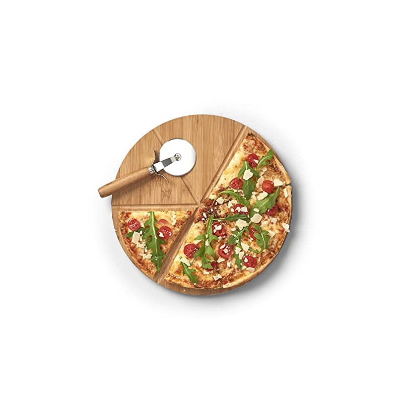 Zeller 25177 Pizza Set, 2 Pieces, Bamboo/Metal, Approx. Diameter 32 x 1.5 cm, Set of Chopping Board and Pizza Cutter, Cut-resistant Pizza Board with 6 Compartments for Evenly Large Pieces, Wooden