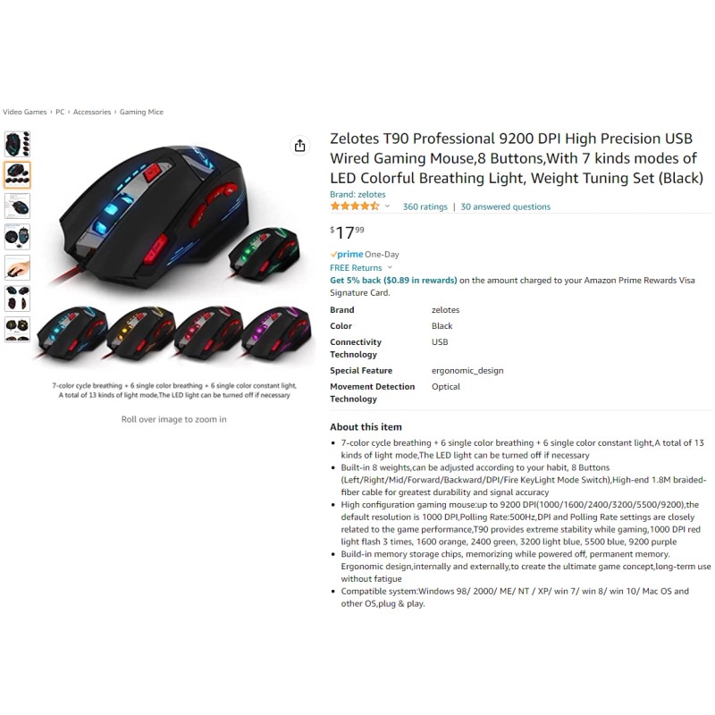 Zelotes New - ZELOTES T-90 8 Key Wired USB Optical Game Mouse