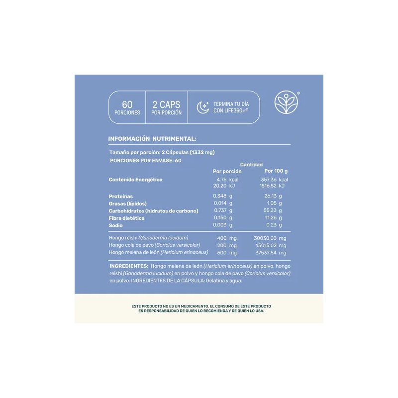 MEZCLA DE TRES HONGOS: Cada cápsula contiene Hongo Melena de León (Hericium erinaceus), Reishi (Ganoderma lucidum) y Cola de Pavo (Coriolus versicolor) en polvo. No exceda la porción de 2 cápsulas por día.