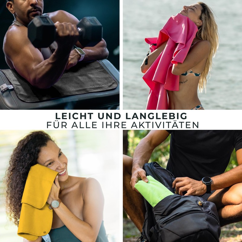 Enjoy the freedom and elegance that our revolutionary microfibre cloth offers you on the go - an indispensable companion for every moment of your active leisure time. Imagine a towel that adapts to the rhythm of your hectic days and fits easily in your bag thanks to its ultra-compact design. Delight in the infinite softness and delicate texture of our unique polyester-polyamide blend that caresses your skin after every intense workout or refreshing dive. Every color in our palette reflects the energy and passion that drives your life. Whether the bright red of the sunsets you admire on hikes or the calm blue that reminds you of calm mornings by the sea, each shade is an invitation to express your unique style. Our commitment to quality and functionality is evident in the towel's quick drying time, a crucial plus point for those who are constantly on the move and want to make the most of every moment of the day. No more waiting for a dry towel. Our advanced technology ensures drying up to three times faster than ordinary towels. The elegant and practical carry bag is the icing on the cake. It is not only used to transport your towel, but also provides space for your most important items such as phone and headphones and accompanies you in style and efficiency on all your trips. Join us on this adventure where style, comfort and practicality meet. Make our microfibre towel a faithful companion in every moment of your dynamic and colourful life.